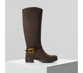Su silueta de caña alta presenta un diseño refinado con textura acolchada tipo matelassé, que aporta volumen y distinción visual. La correa decorativa en tono chocolate con hebilla metálica dorada añade un acento moderno y sofisticado, realzando su carácter urbano.
