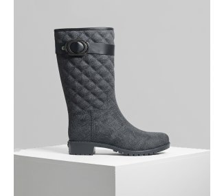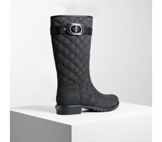 Su silueta de caña alta presenta un atractivo diseño acolchado tipo matelassé, que aporta textura y distinción, mientras que la correa lateral con hebilla circular en tono negro brillante añade un toque contemporáneo y elegante.