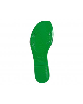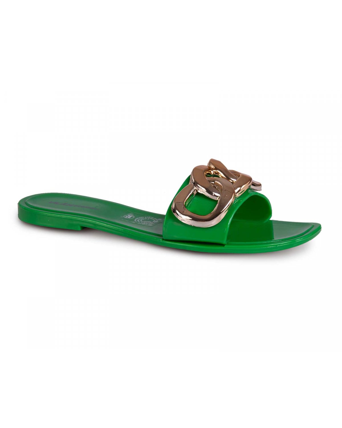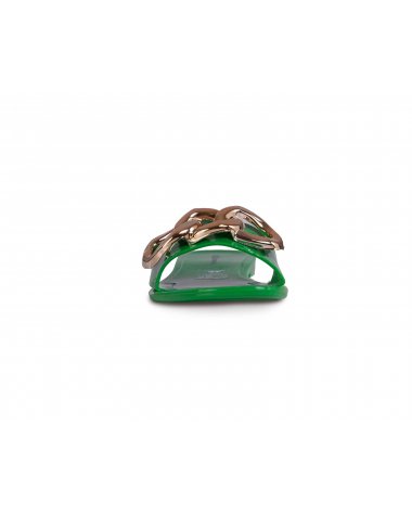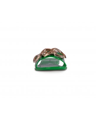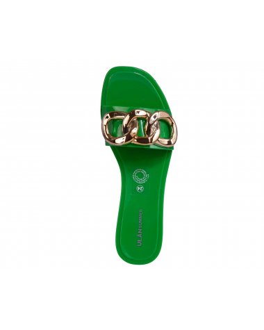 Sandalia casual para dama en color verde modelo de chinela con accesorio de cadena metalizado en color oro. La tecnología Slipdry de Ulän Summer es novedosa en el mercado del calzado y es ideal para mantener tus pies frescos y lucir a la moda este verano.