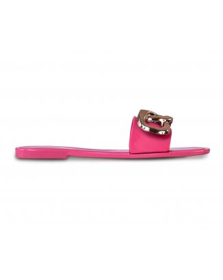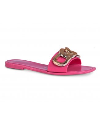 Sandalia casual para dama en color rosa modelo de chinela con accesorio de cadena metalizado en color oro. La tecnología Slipdry de Ulän Summer es novedosa en el mercado del calzado y es ideal para mantener tus pies frescos y lucir a la moda este verano.
