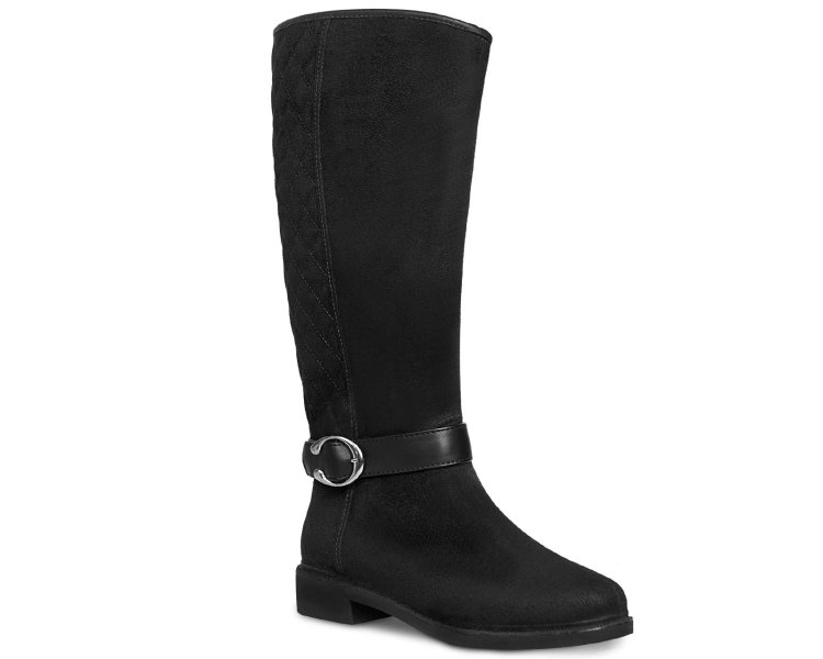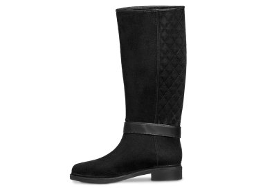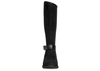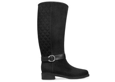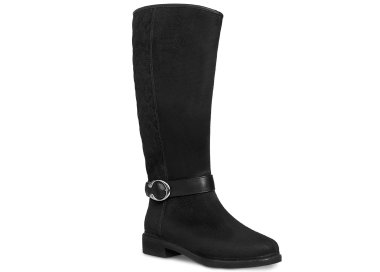 Bota de vestir para dama en color negro, modelo de tubo alto con textura durazno, con detalle metálico y suela antiderrapante, complementando con nuestra tecnología Polidry. La tecnología Polidry de Ülan es única en el mercado, esta moderna y novedosa tecnología convierte a tus botas Ülan en botas 100% impermeables, lo que le permite mantener a tus pies protegidos de las adversidades del clima...