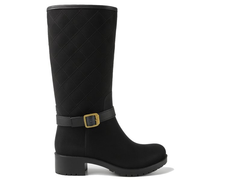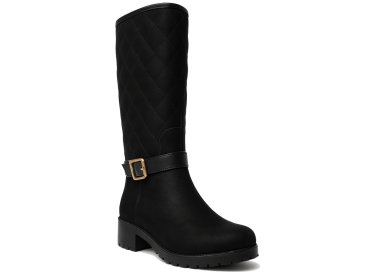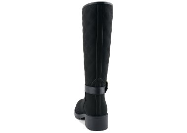 Bota de vestir para dama en color negro, modelo de tubo alto con textura durazno, con detalle metálico y suela antiderrapante, complementando con nuestra tecnología Polidry. La tecnología Polidry de Ülan es única en el mercado, esta moderna y novedosa tecnología convierte a tus botas Ülan en botas 100% impermeables, lo que le permite mantener a tus pies protegidos de las adversidades del clima...